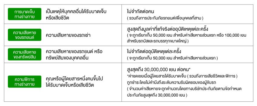 - ค่าคุ้มครองความเสียหายทางธุรกิจ NOC (Non Operation Charge) กรณีรถเกิดอุบัตเหตุ, ถูกขโมย, เสียหาย, สกปรก ฯลฯ จนจำเป็นต้องซ่อม หรือ ทำความสะอาด (นำรถมาคืนที่สาขาได้ ลูกค้าต้องรับผิดชอบเป็นจำนวน 20,000 เยน / นำรถมาคืนที่สาขาไม่ได้ ลูกค้าต้องรับผิดชอบเป็นจำนวน 50,000 เยน)