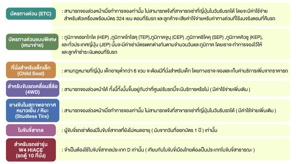 - การบริการช่วยเหลือกรณีฉุกเฉิน กรณีมีปัญหาเกี่ยวกับรถเช่า (ติดต่อผ่าน Call Center ที่ ญี่ปุ่น)