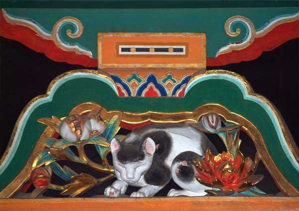 ทางด้านขวามือจากประตูใหญ่เป็นทางเข้าชมงานประติมากรรม ภาพแกะสลักแมวหลับ (Sleeping Cat) ที่มีชื่อเสียงดังไม่แพ้ลิงสามตัว ผลงานของศิลปิน ฮิโดริ จินโกโร่ เช่นเดียวกัน